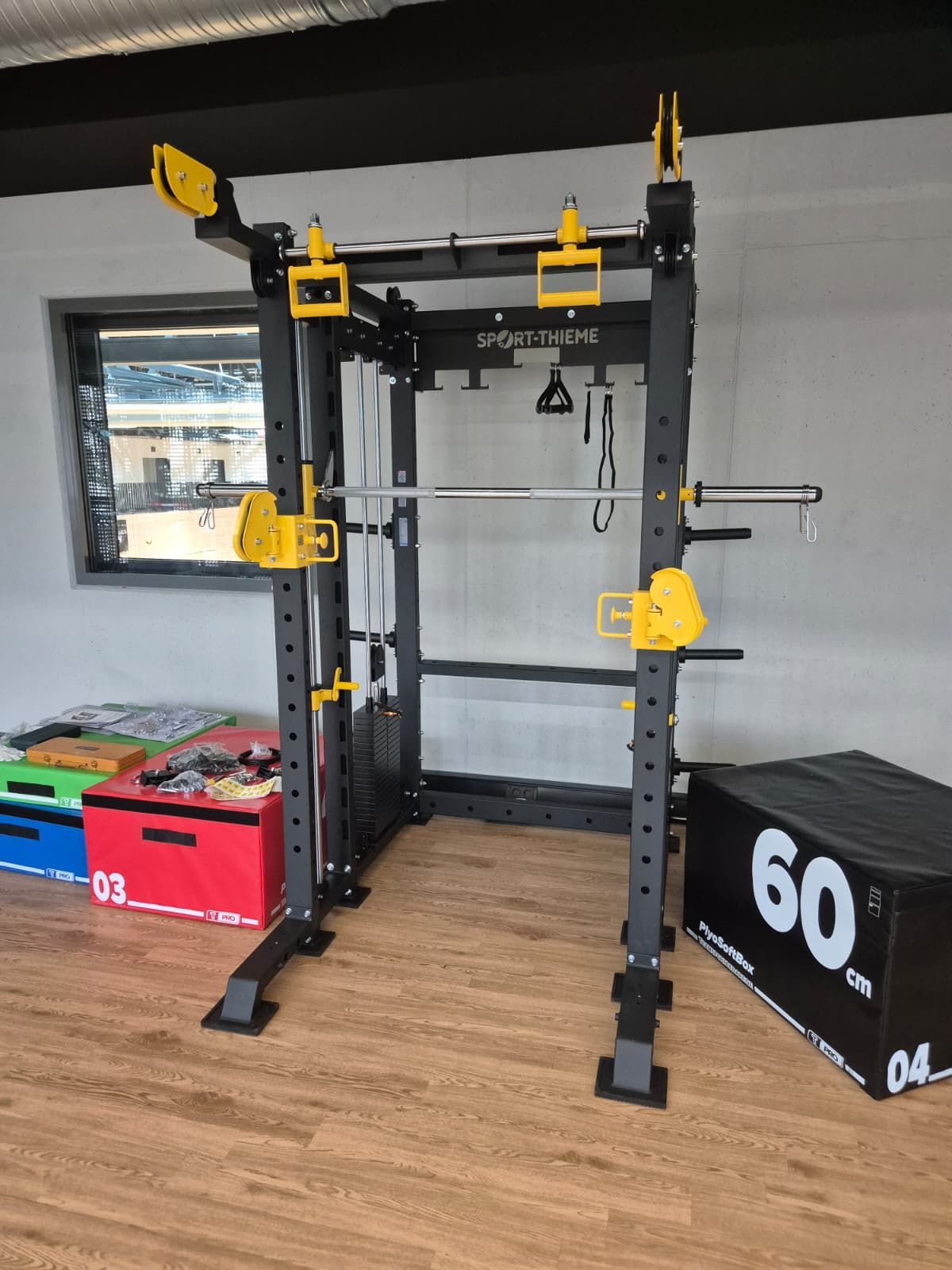Dafür wurden Ein Schwarz-Gelber Multifunktions Smith-Trainer 800 von Thieme Sport, mir 2x 90kg Zuggewichten, Eine Thieme Sport Kombibank , ein 100kg Speed-Pulley, ein Set Plyo-Blöcke 60, 45, 30, 154 cm sowie 3 Hantelbänke und Rumpfmuskulatur-Trainer angeschafft. Alle haben nicht nur den Weg in die Halle geschafft, sondern wurden dereits teilweise schon aufgestellt.