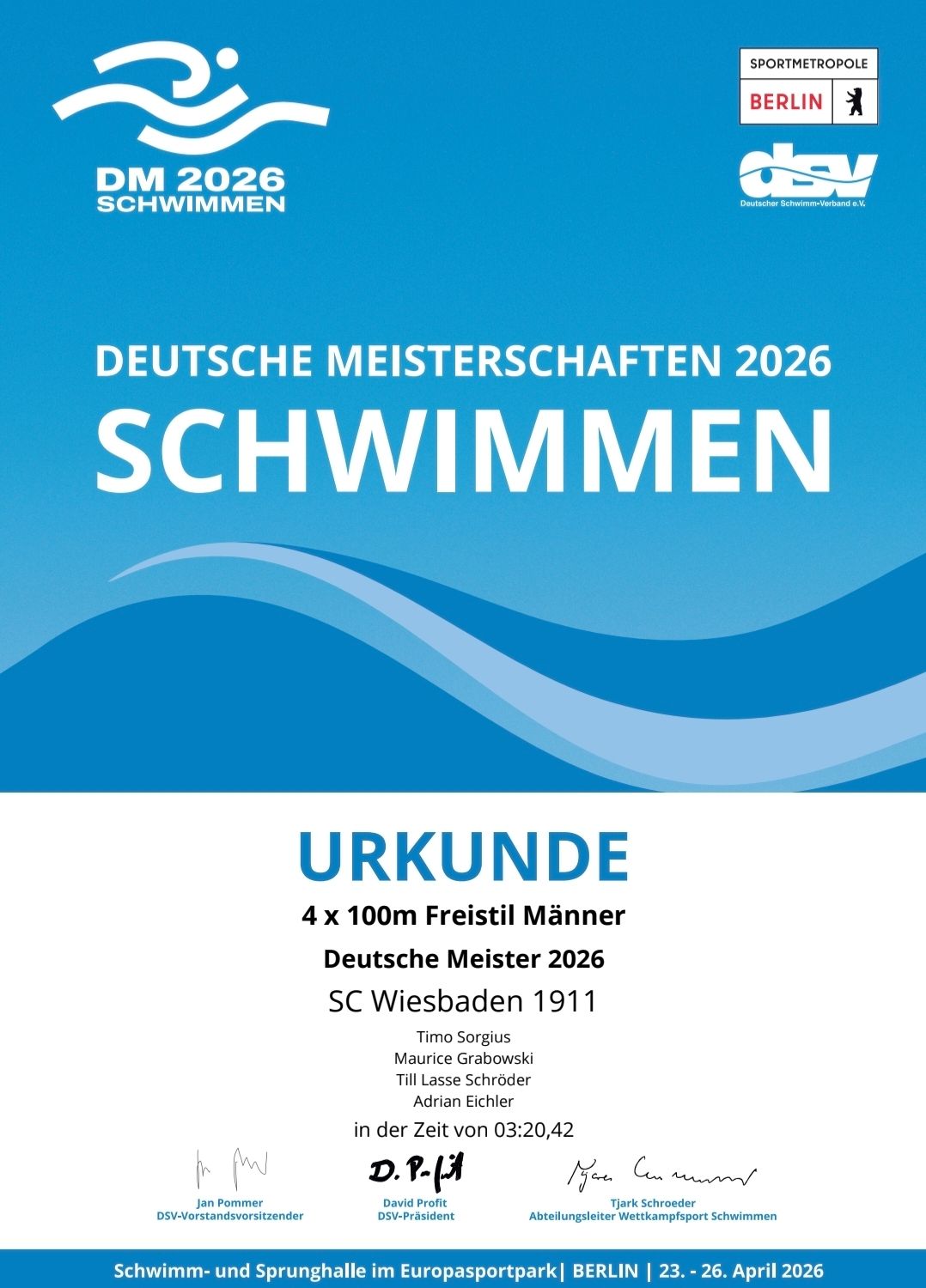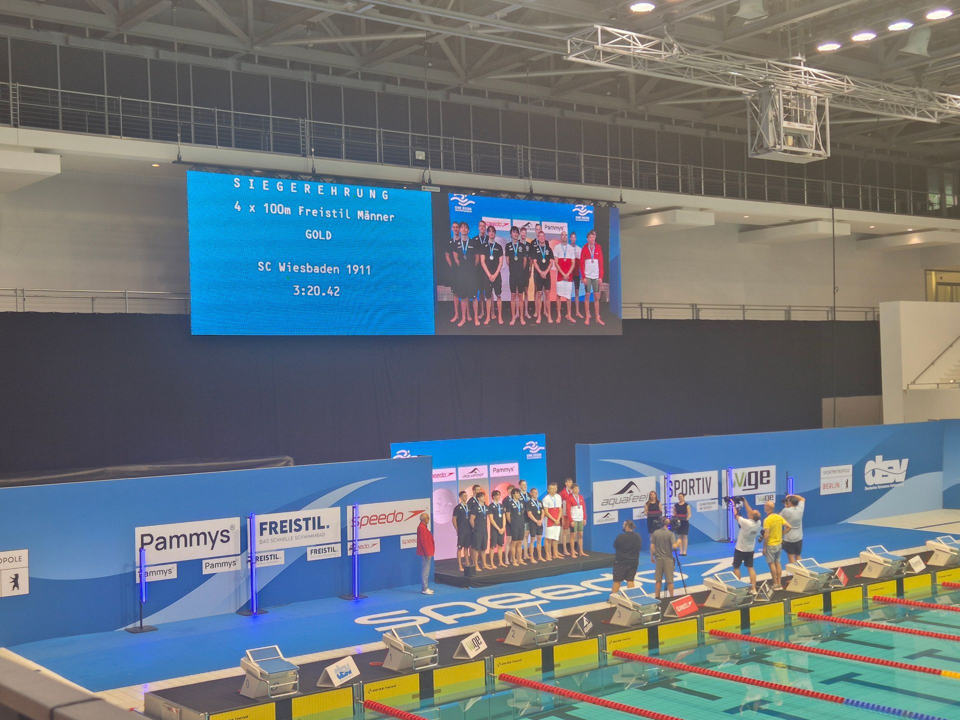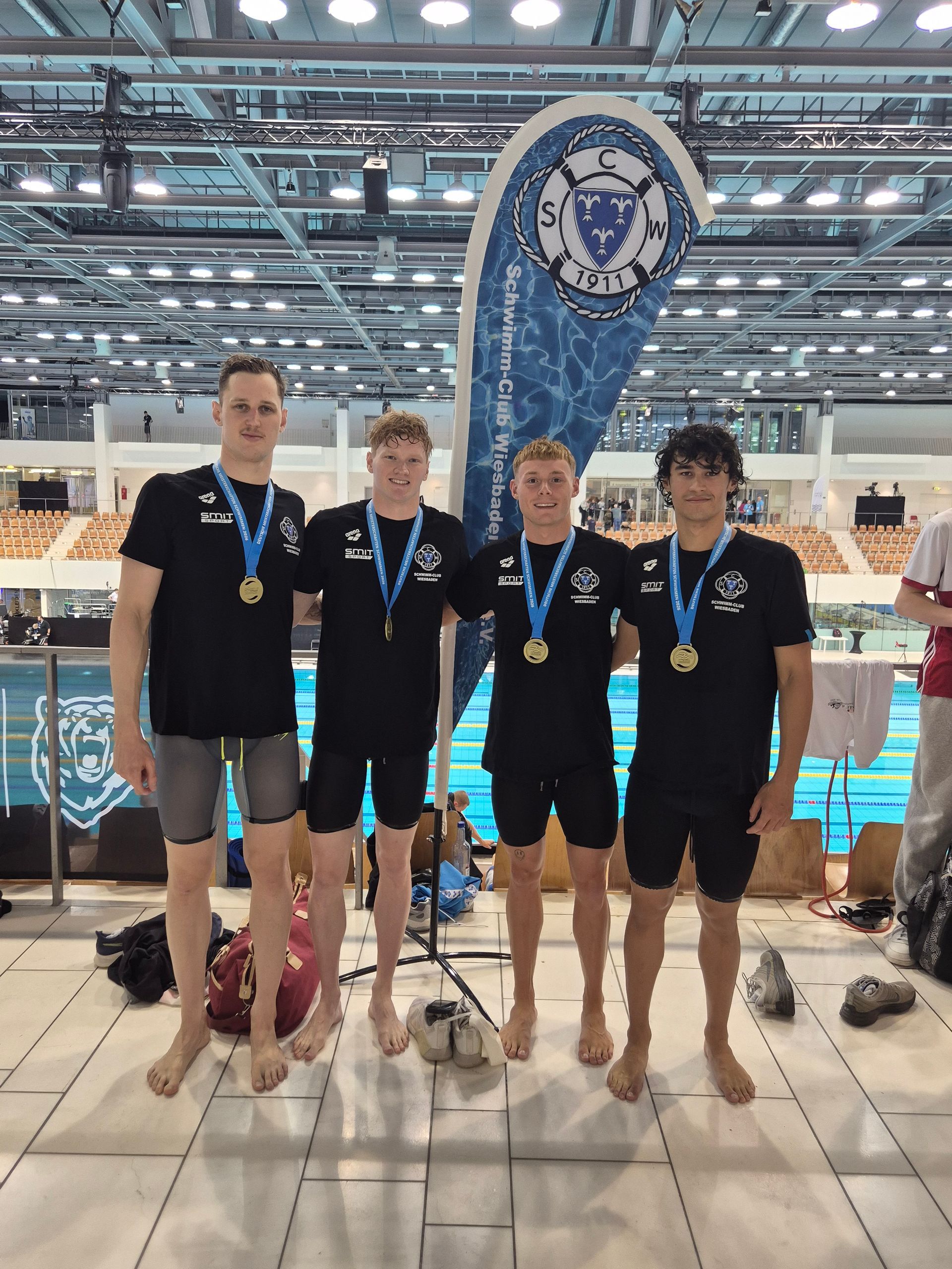 Zum Abschluss des Tages schwamm die SCW Staffel 4 x 100 m Freistil Männer mit Timo Sorgius, Maurice Grabowski, Till Lasse Schröder und Adrian Eichler erneut Gold mit deutlichem Vorsprung ein! Die nächsten 4 Deutschen Meister des SC Wiesbaden !