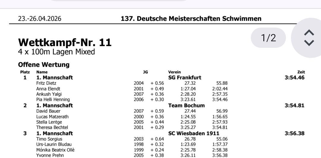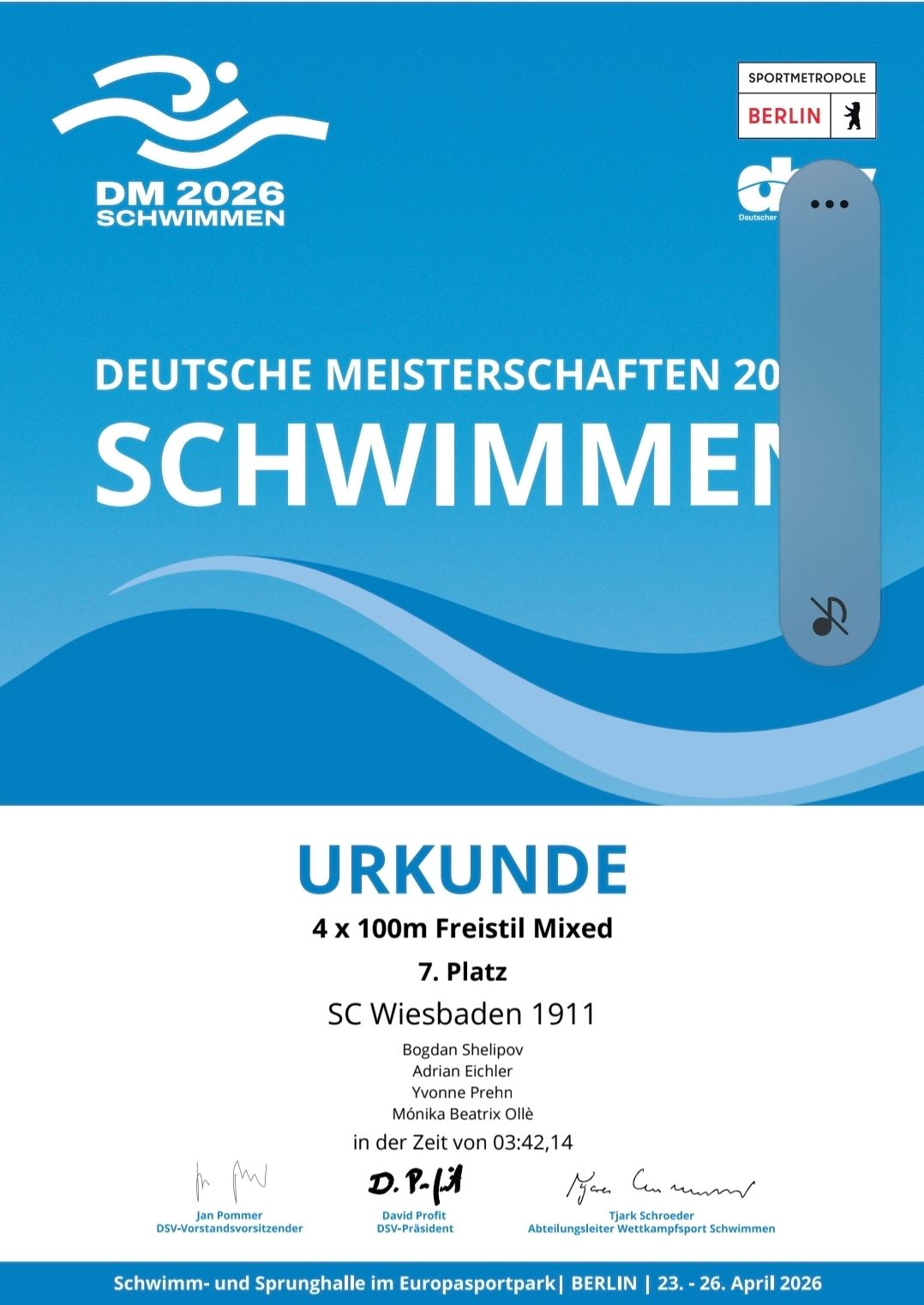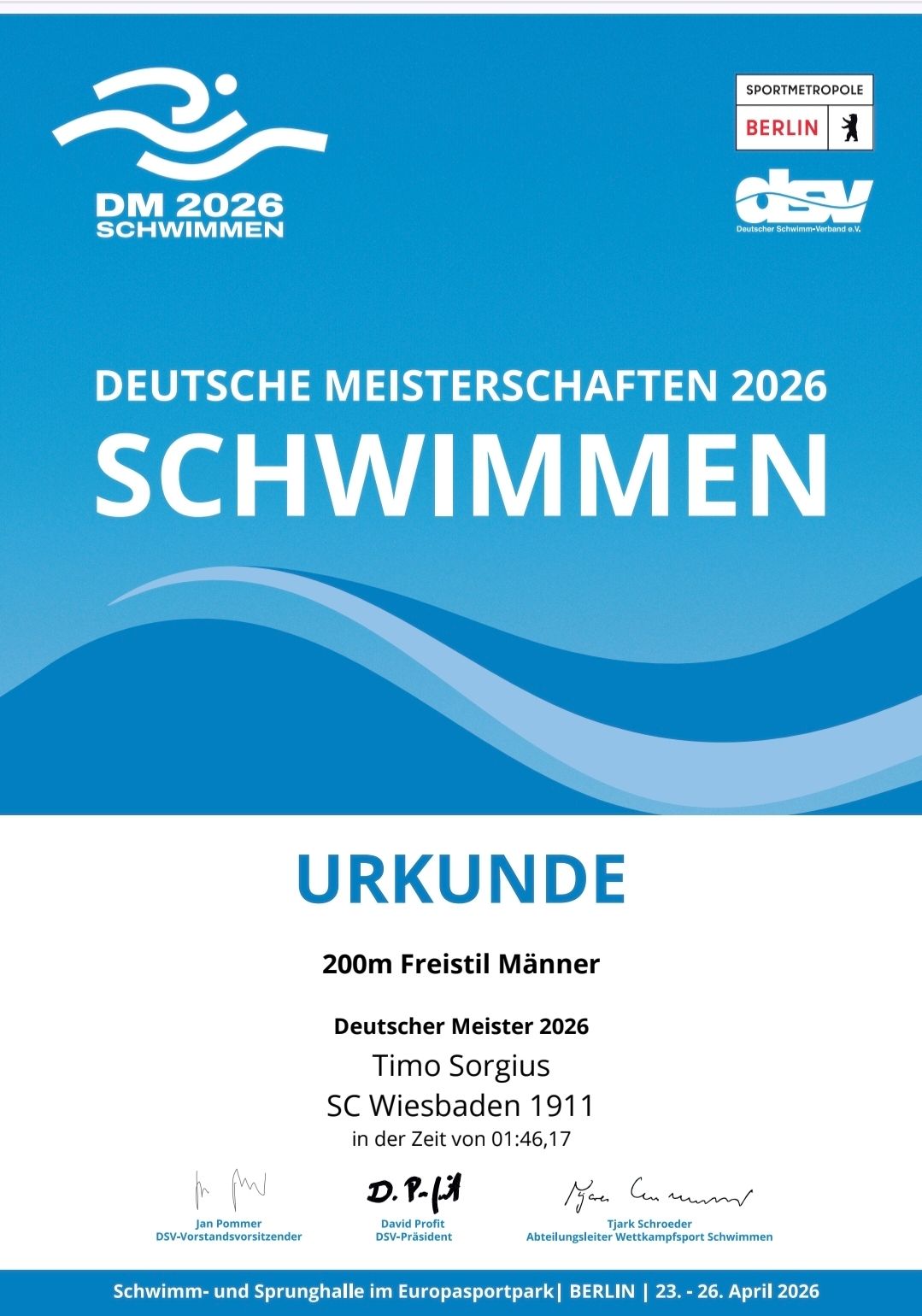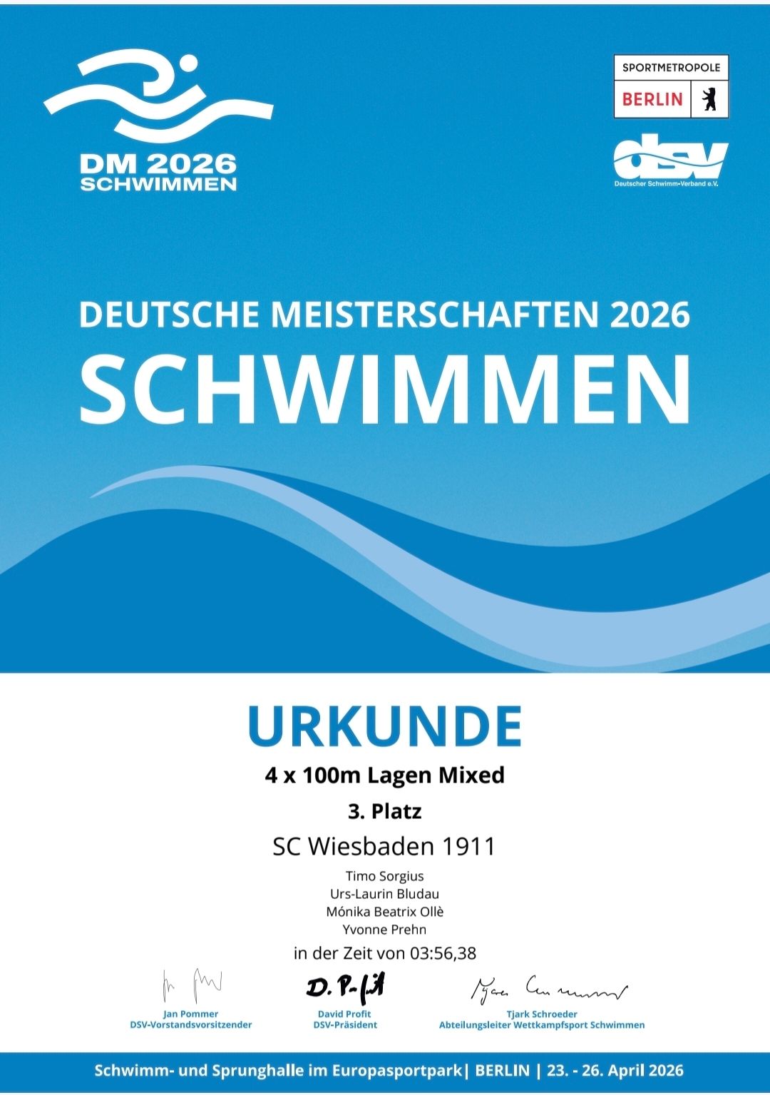 Mit 2 Schwimmerinnen und 8 Schwimmern ist der SCW bei den Deutschen Meisterschaften 2026 in Berlin angetreten. Diesmal eine kleine Mannschaft, da gerade einige im Abitur sind und andere durch die "Road to DJM" einen anderen Focus haben.