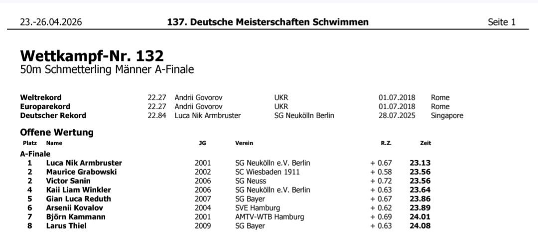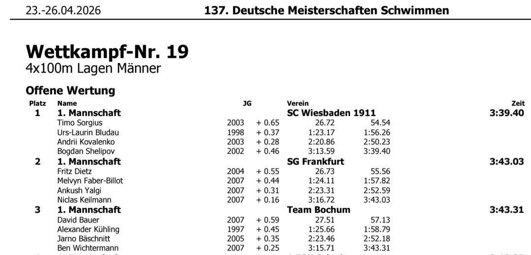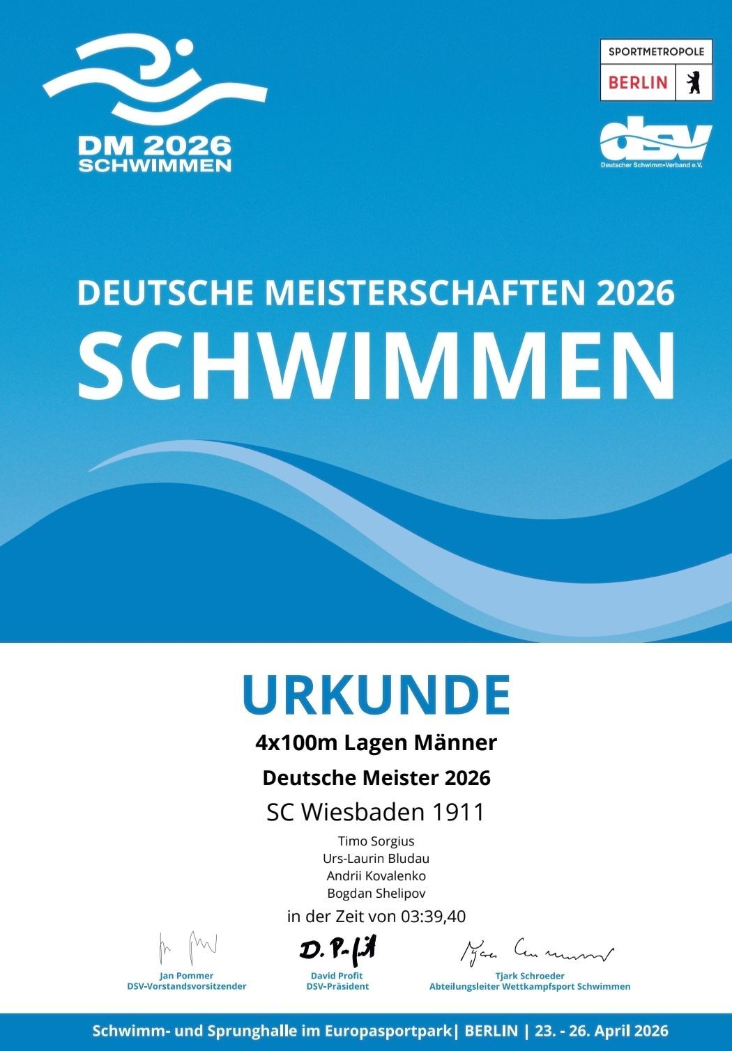 Die 4 x 100 m Lagen Staffel der Männer mit Timo Sorgius (Rücken), Urs Bludau (Brust), Andrii Kovalenko (Schmetterling) und Bogdan Shelipov (Freistil) schwammen auf den ersten Platz mit deutlichen Abstand auf SG Frankfurt als zweite. Gold am Vormittag für das SCW Team und 4 neue Deutsche Meister!