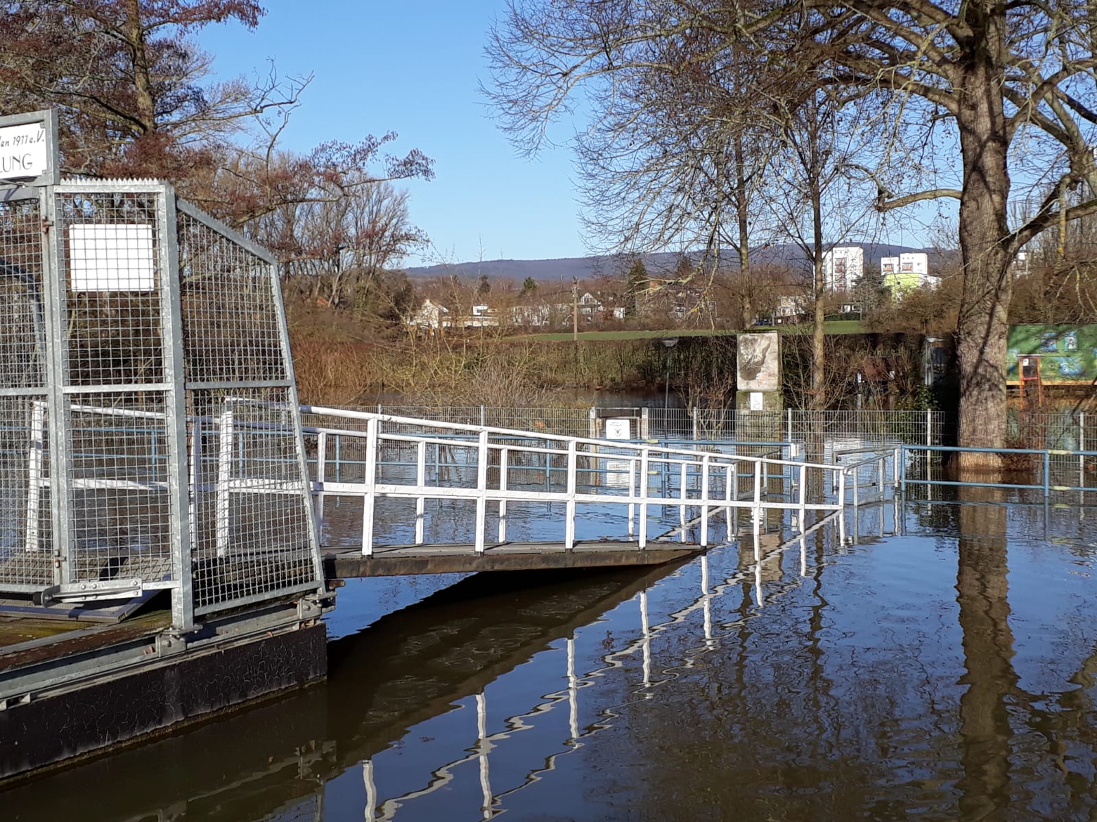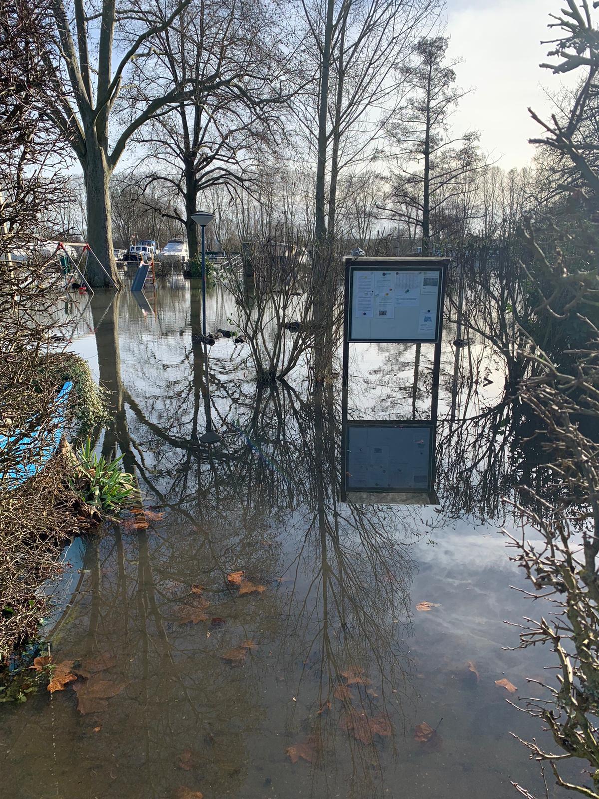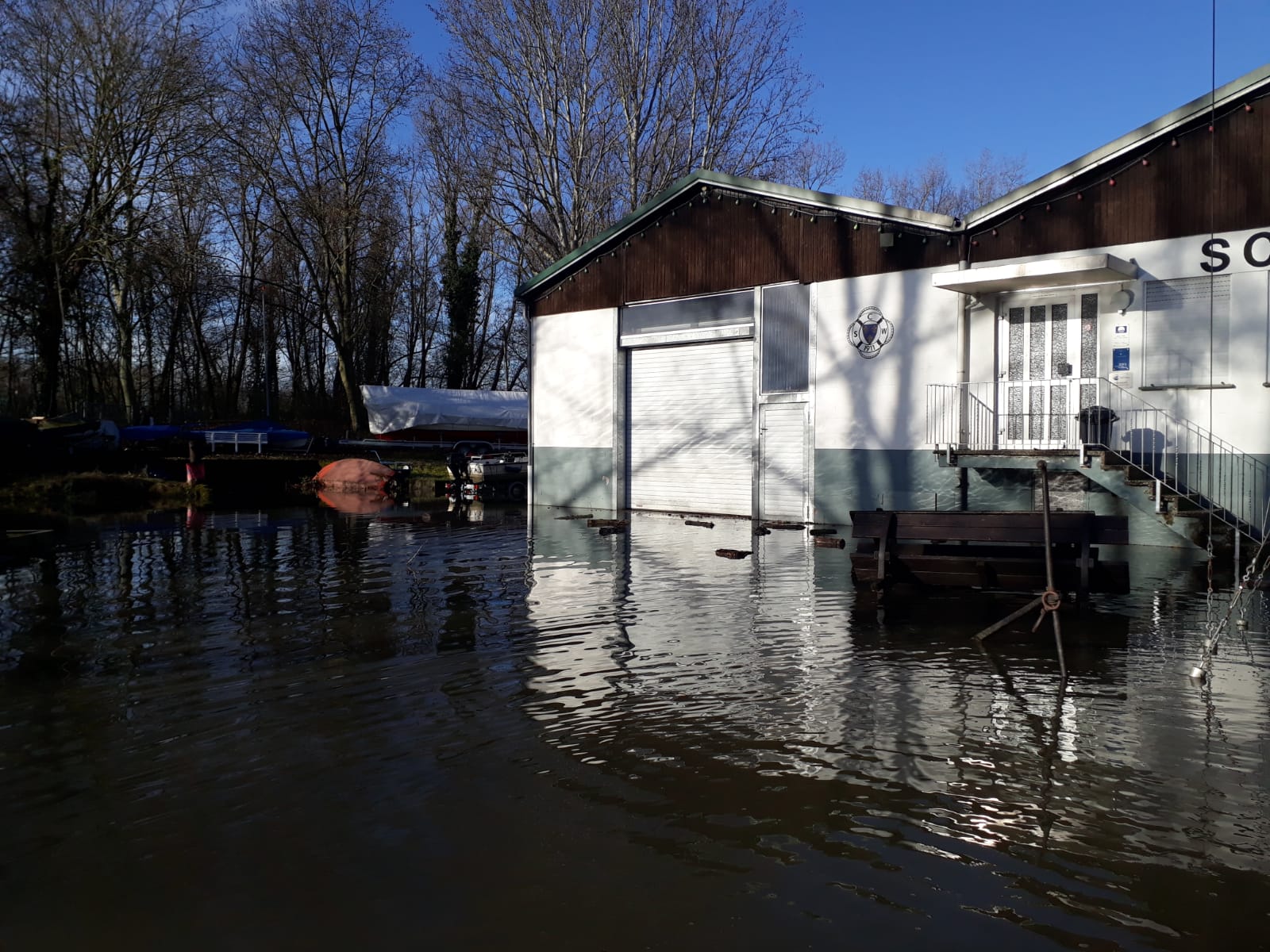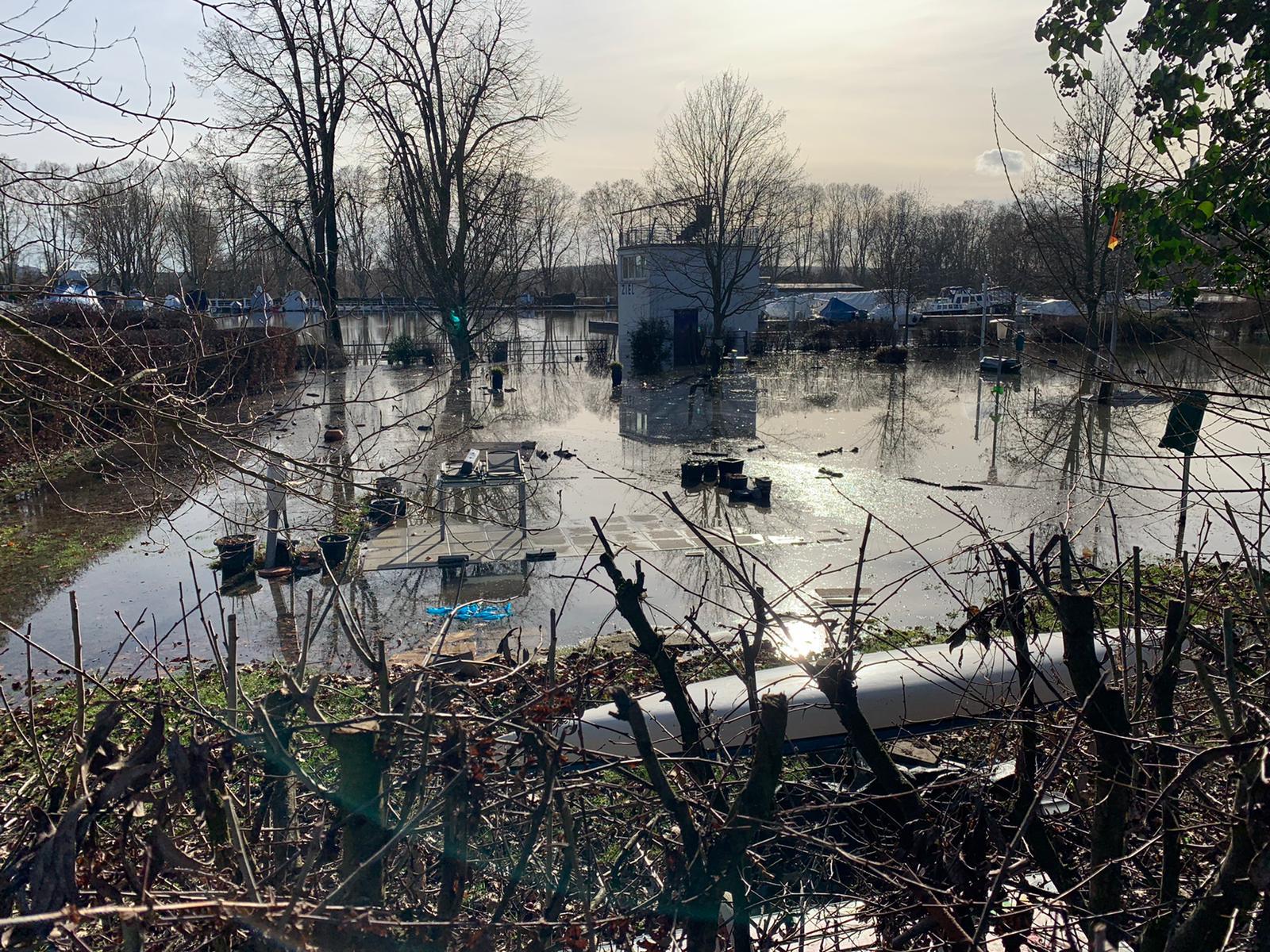 Aktuell (06.02.21) liegt der Pegel bei 6,39m (Tendenz steigend) und hat das SCW Vereinsgelände komplett überflutet. Auch in der Bootshalle steht schon das Wasser